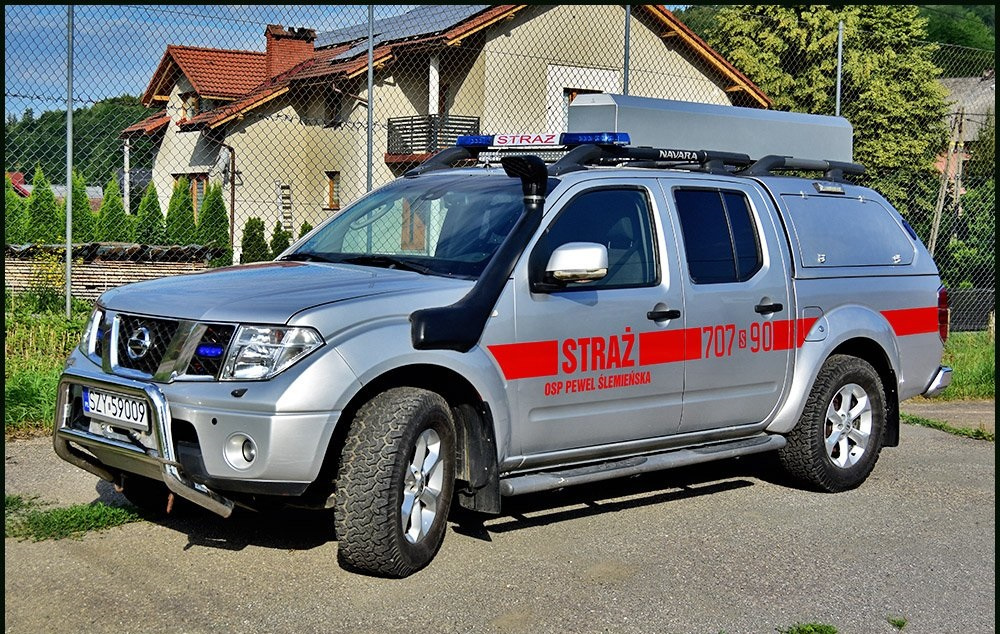 Na wyposażeniu pojazdu Nissan Navara znajduje się torba medyczna R1, radiotelefon przewoźny, pilarka, podręczny sprzęt burzący, tłumice, podnośnik Hi-lift, a także profesjonalny sprzęt do ratownictwa wysokościowego oraz trójnóg ratowniczy. Pojazd wyposażony jest w napęd 4x4, przystoswowany do przewozu pięciu strażaków. Rok produkcji 2008.